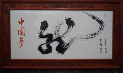 在當天的活動中,王易生的草書一筆龍,已達到了較高的藝術境界,其一氣呵成的書寫方式在書畫界更是一絕。“龍”字的前部象征著中華兒女祈福納祥,國泰民安;中部象征著中華大地改革之勢,波瀾壯闊;尾部象征著中華民族偉大復興、巨龍騰飛、正當其時。“龍尾”,似騰龍奔逐,奇幻莫測,給人極強的心靈震撼。