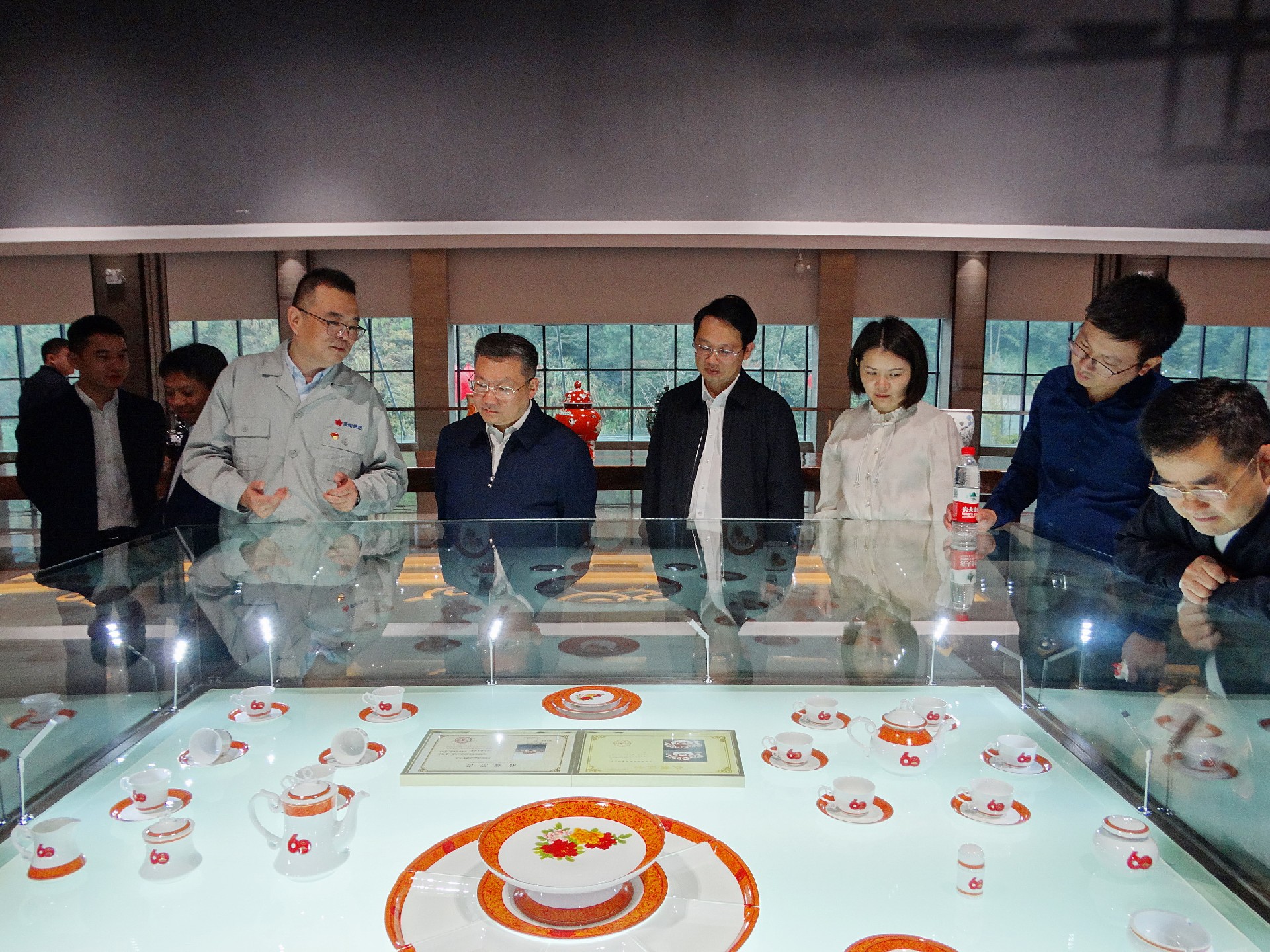 在國瓷館,胡軼向陳澎一行講解國瓷館內(nèi)的基本情況和產(chǎn)品特色。大家一路走一路看一路聽,胡軼向重點介紹了“新中國成立60周年國慶慶典天安門觀禮臺專用瓷”、“‘瀛臺夜話’接待外國元首用瓷”、“古典園林”、“首長專列用瓷”等。一個個國瓷故事和工藝細(xì)節(jié),引得眾人贊嘆不已。陳澎還仔細(xì)詢問了企業(yè)生產(chǎn)經(jīng)營、對外貿(mào)易等情況。