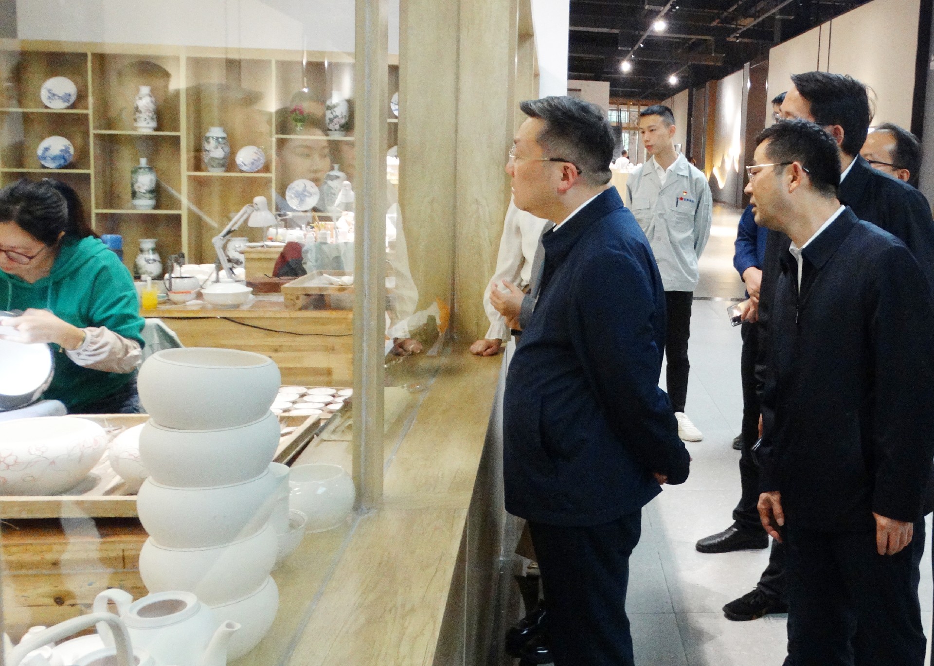 在繪畫展示窗口,工人們正聚精會神地繪制碗、盤等器皿。陳澎饒有興致地觀看,并連連稱贊她們的技藝,胡軼隨即說道,我們集團對專業(yè)技術(shù)人才非常重視,還相繼出臺了一系列激勵措施,陳澎聽后給予了高度肯定和稱贊。